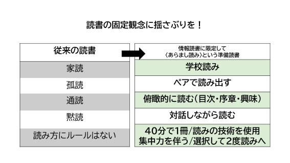 アメリカの「ブック・クラブ」や「リーディング・ワークショップ」のように、日本でも〈あらまし読み〉を授業の中に取り入れて、ペアで読むことから始める習慣を作って働きかけています。